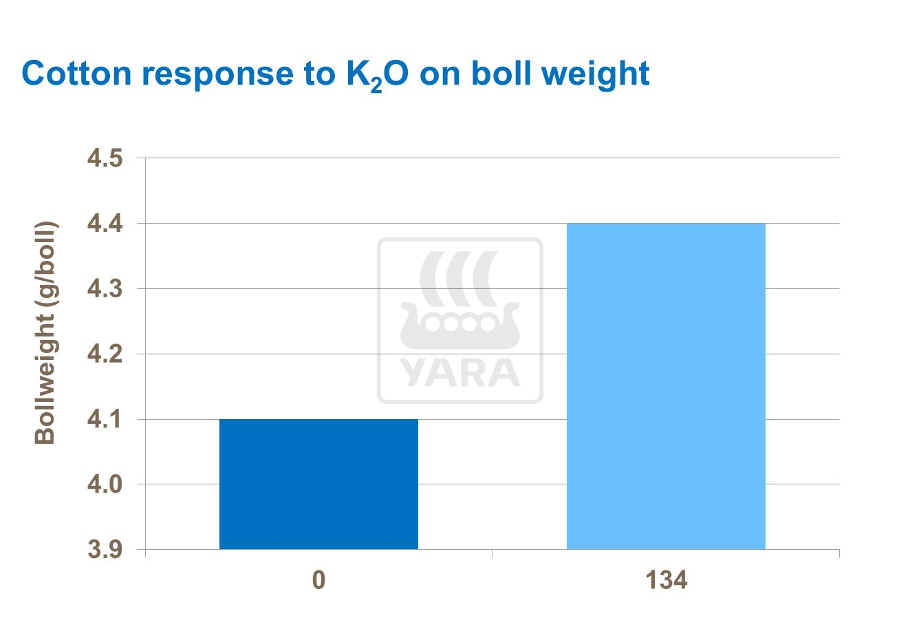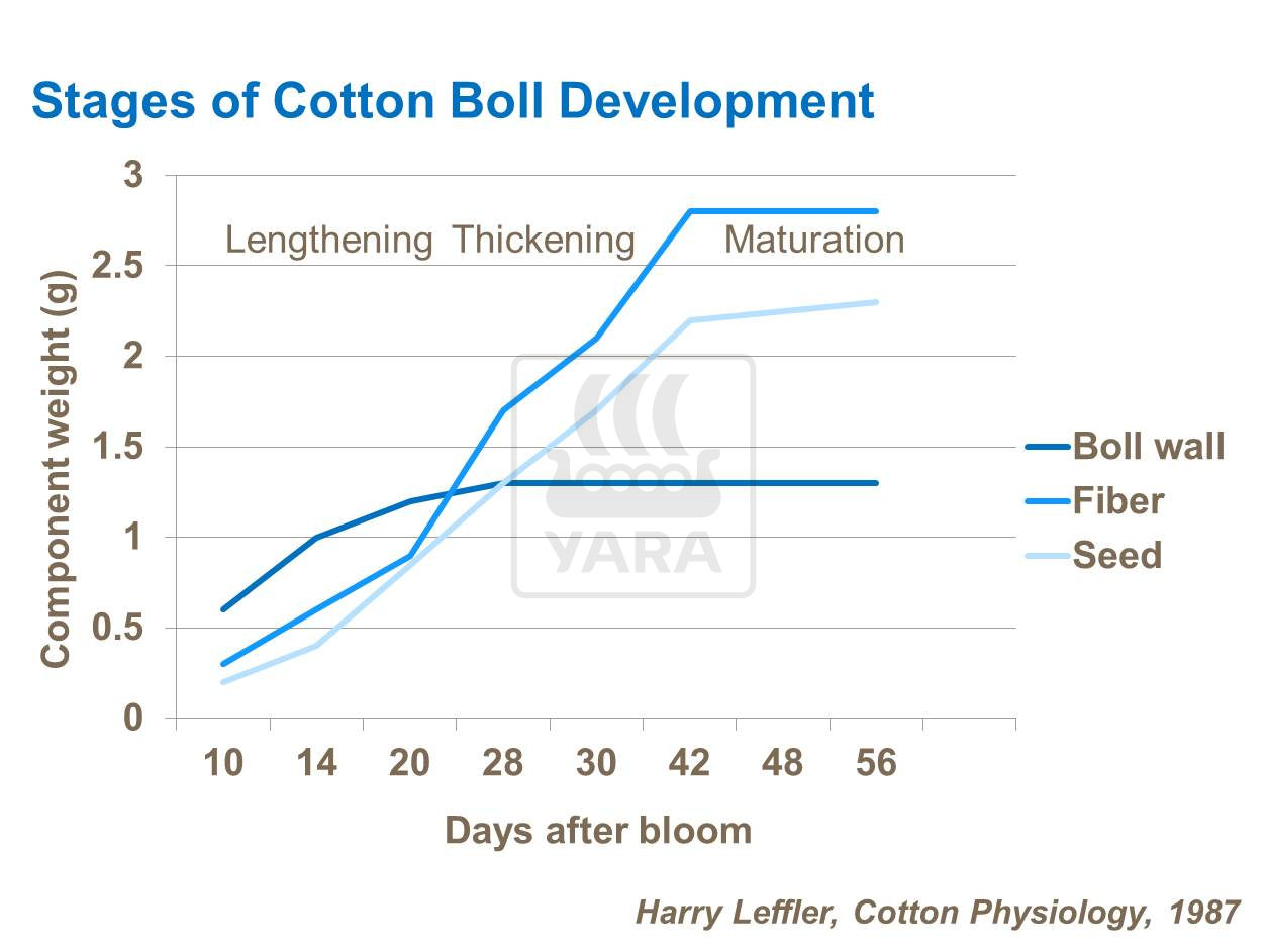 El potasio juega un papel importante en el crecimiento de la fibra y deficiencias pueden tener un efecto negativo en el peso de la cápsula por falta de desarrollo de fibras. Suministros faltantes de potasio resultará en baja calidad de fibra, cápsulas irregulares y rendimientos bajos.