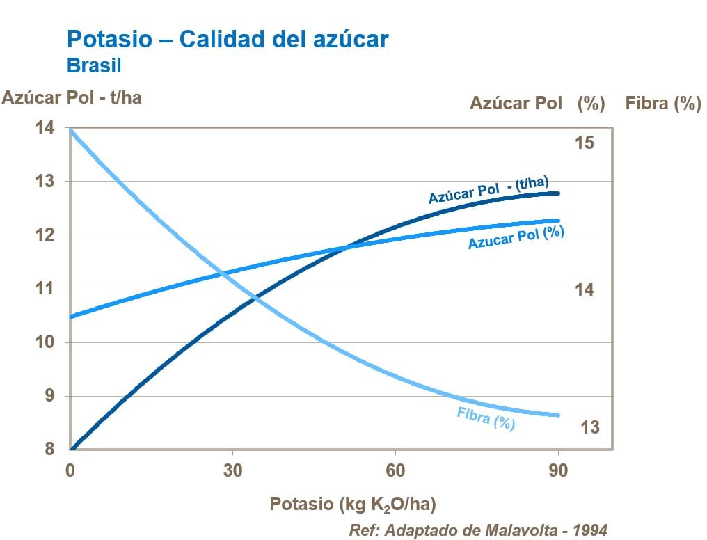 En ensayos con aplicaciones de potasio foliar 6 a 8 semanas antes de la zafra, los investigadores reportaron un incremento de 15,1% en °Brix, y 20% en Pol y una reducción en contenido de fibra de 28%. También es importante tener suficiente potasio disponible para poder usar el nitrógeno asimilado en la caña para tener una buena maduración del cultivo y asegurar que los azúcares reductores se conviertan a sacarosa.