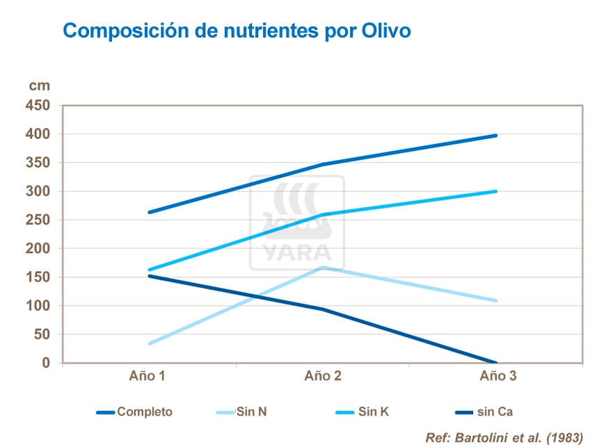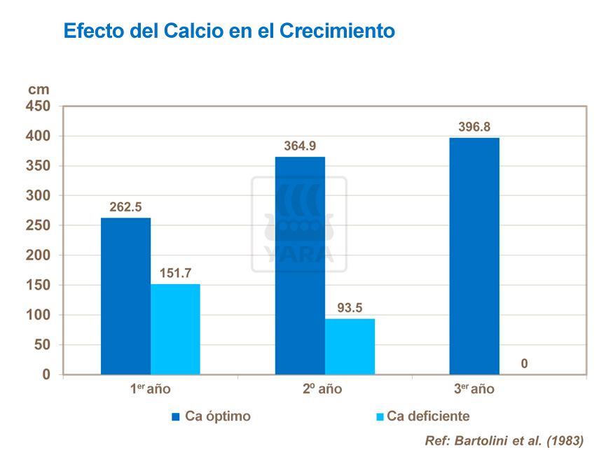 La disponibilidad de Calcio en olivos jóvenes es necesaria para conseguir un adecuado desarrollo y si se dieran unas condiciones de deficiencia extrema el árbol podría morir. El desarrollo radicular se verá fuertemente potenciado cuando se usan soluciones enriquecidas con Calcio ya que esto fomenta el desarrollo de nuevas raíces y por ello favorece el vigor del árbol (demostrado científicamente a través de experimentos llevados a cabo con una solución hidropónica sobre un olivo de dos años cultivado durante un periodo de 3 años con una nutrición salina - Acta Hortic. 133:111-118).